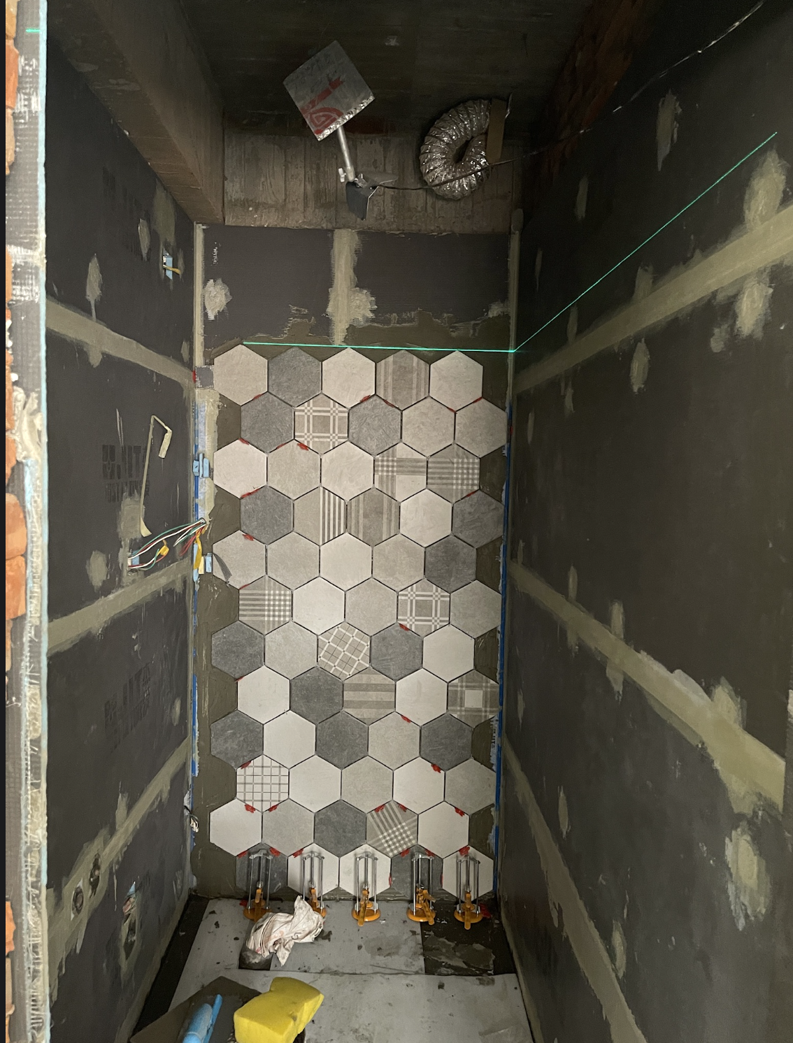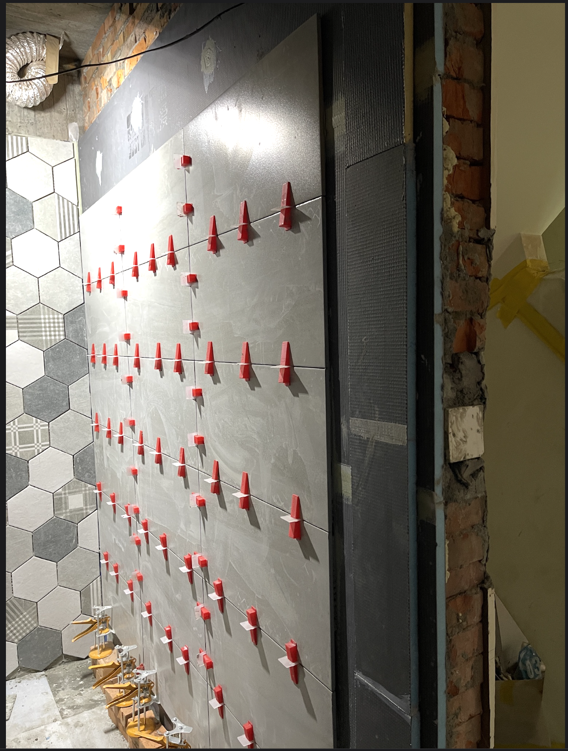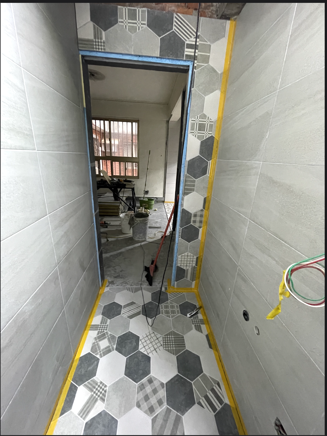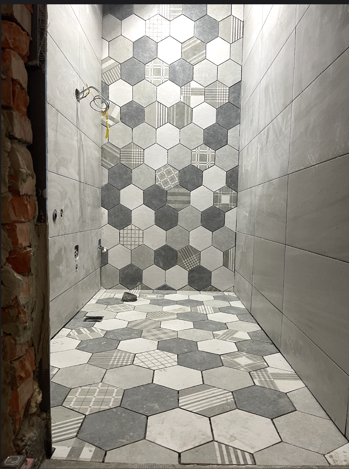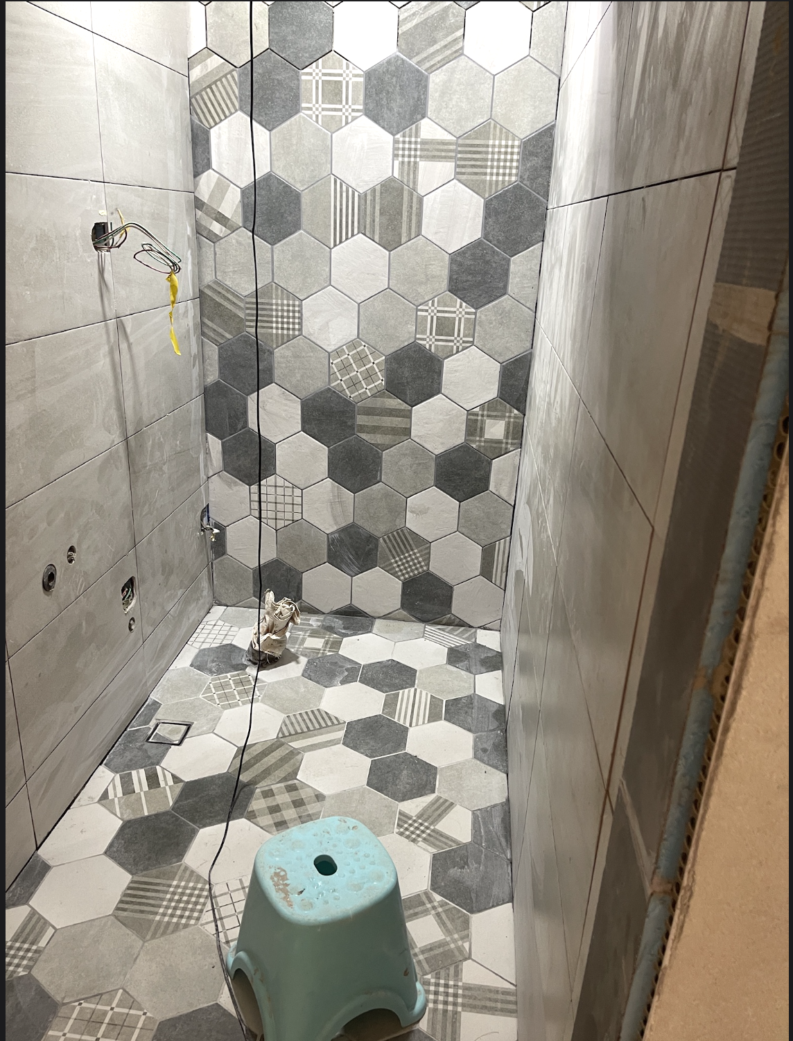 上三種素色+一種花磚的六角磚,四種磚混用最大的問題在於尺寸跟厚薄,雖然都是同一個品牌,外加廠商是將庫存送過來,因此批次並不相同,尺寸差異大(包含厚度以及平面尺寸),導致縫隙只能放大,透過較大的縫隙來修飾視覺觀感