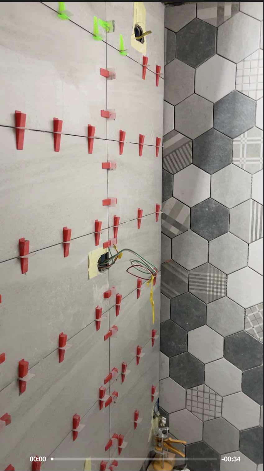 鋪貼輔牆的牆磚,因牆面平整度控制得宜,因此磁磚膠厚度大約只在0.2-0.3cm之間,且施工速度快,幾乎不需要任何的反工,小白有很大的機率一次成功。