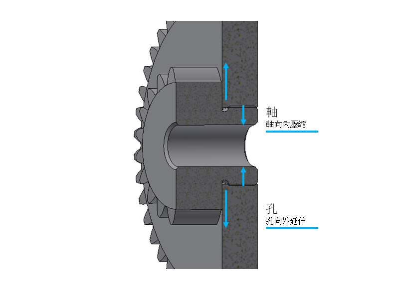 透過誇大的干涉展示了施加在孔上的拉伸力、施加在軸上的壓縮力以及由此產生的環向應力。