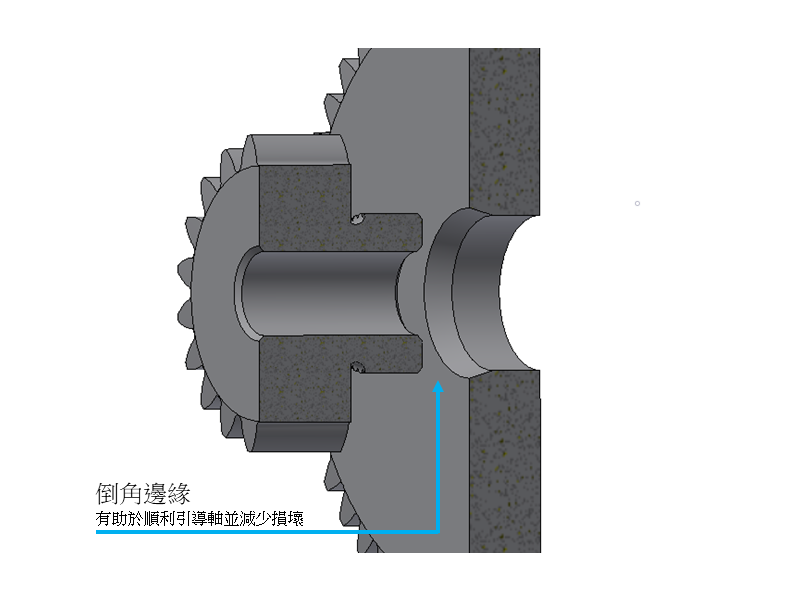 為了減少嚙合問題以及傾斜配合和零件擦傷的風險,採用柔和的導入方式可以實現更漸進的嚙合,從而更有效地實現自定心。孔上的 30° 倒角有助於提高定心效果,且不會影響配合精度。