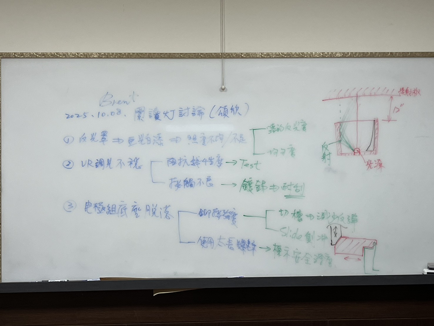 1.燈罩→內部噴漆要給IDP負責,亞光白漆→照度不均/不足,測試有3有1.5,至少2最多3