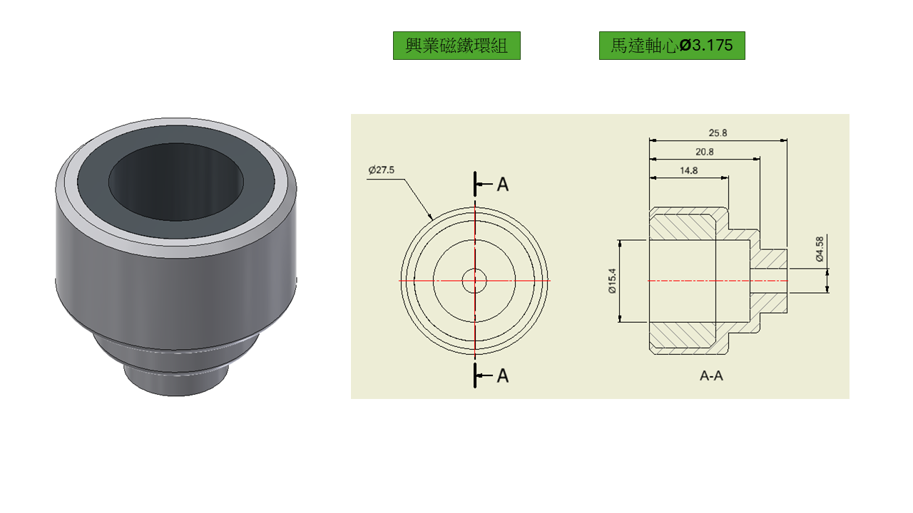 1.興業磁鐵環孔徑Ø4.58與馬達軸徑Ø3.175不合