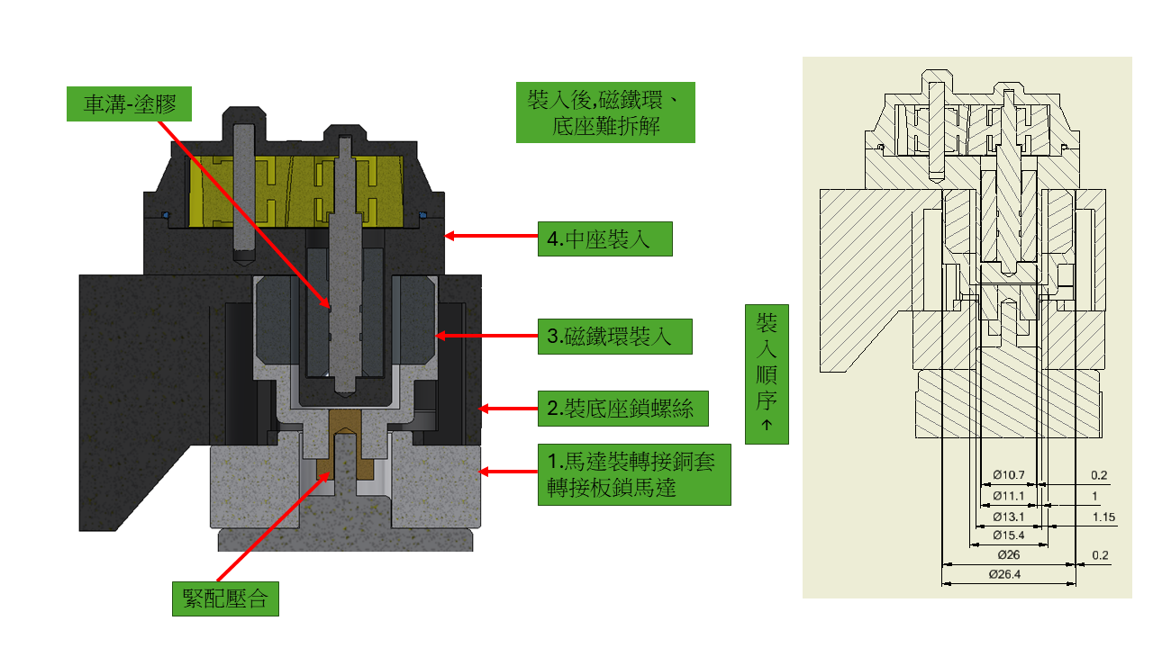 4.磁鐵與軸棒不能緊配壓合,磁鐵會裂,軸棒小3~5條塗膠