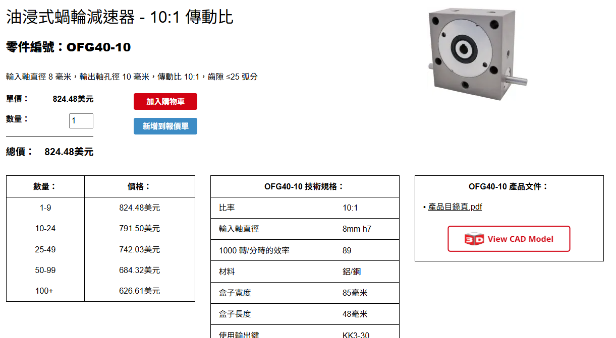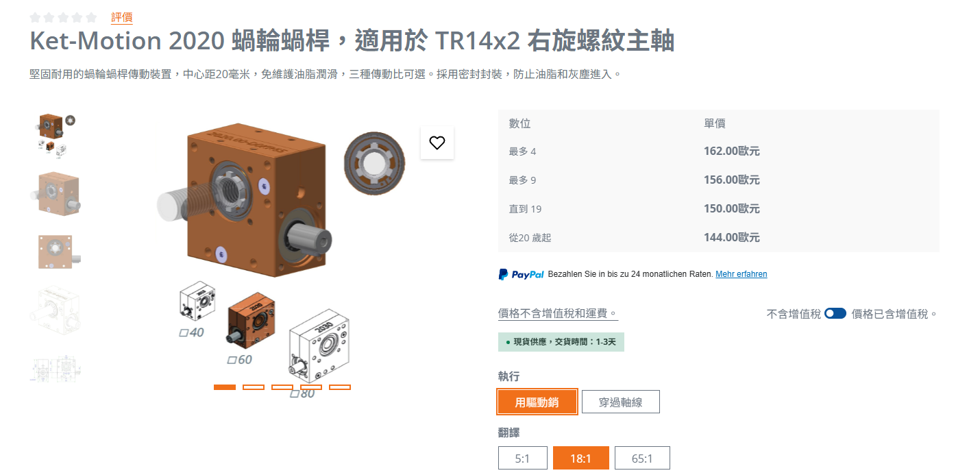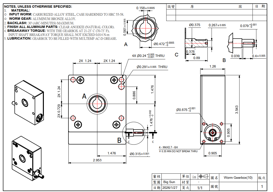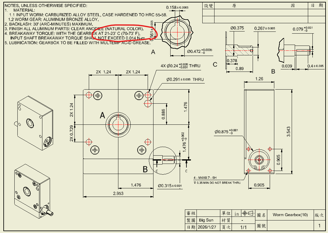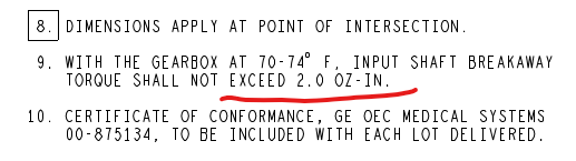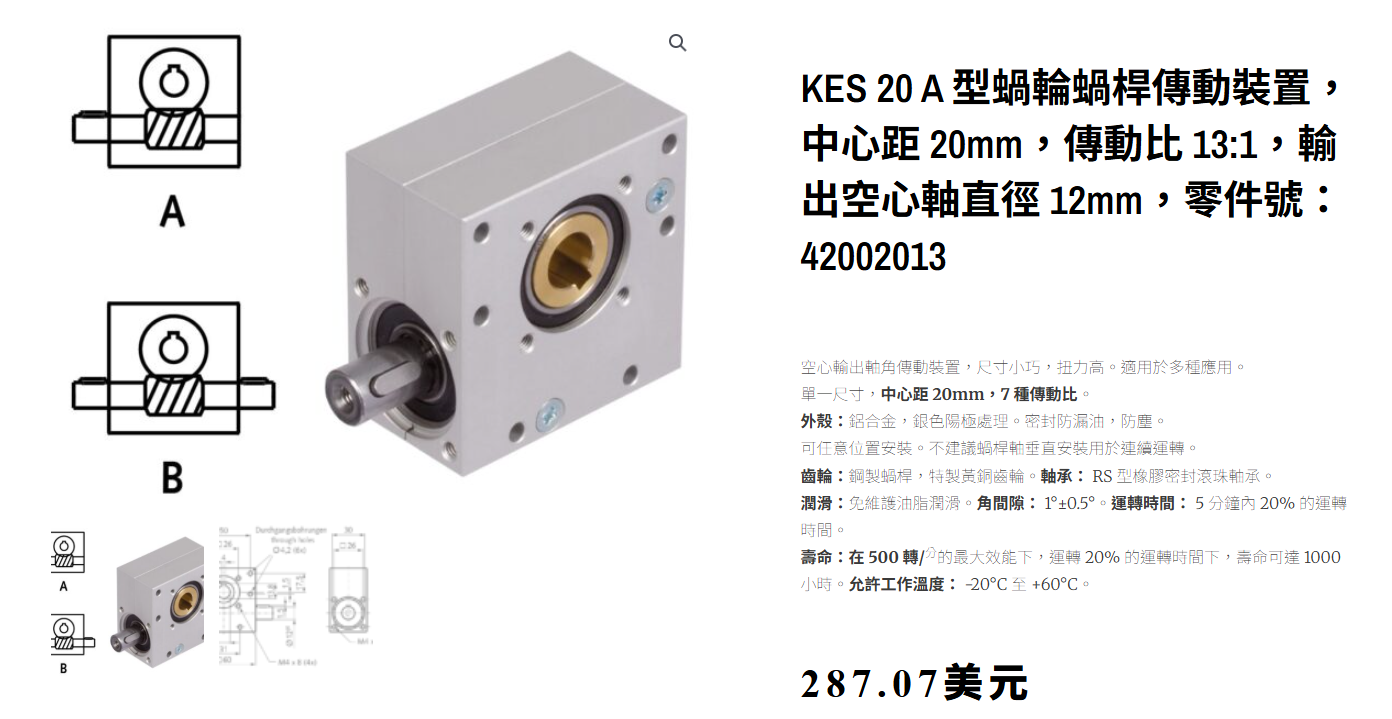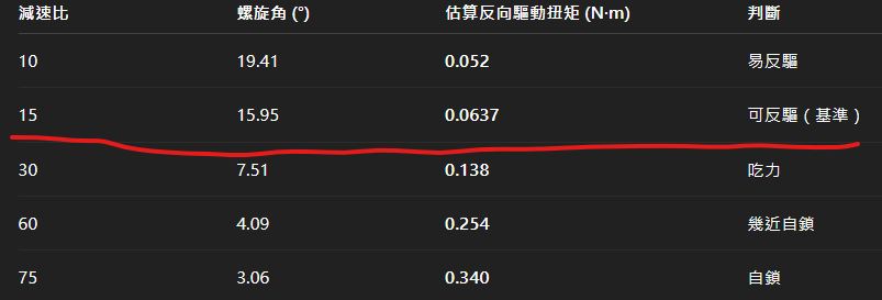15比蝸桿減速箱(軸承雙蓋式),反向驅動扭矩0.65 kg-cm ≈ 0.0637 N-m ≈ 0.564 in-lbs