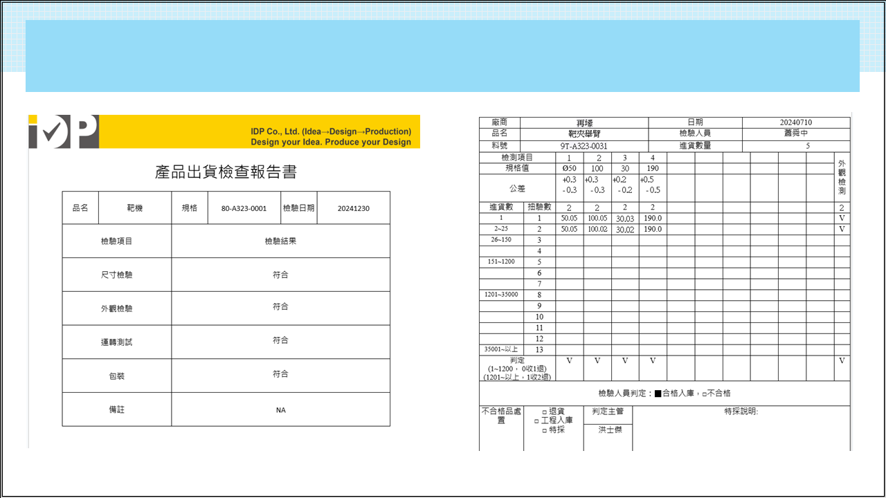- 進料檢驗資料及出貨報告的連結,確保產品符合質量標準。