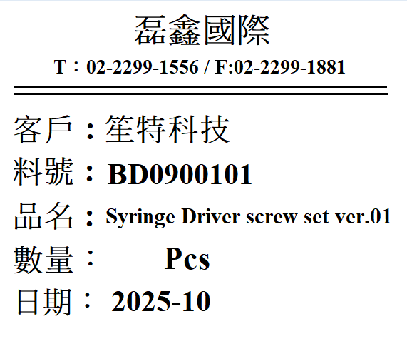 笙特料號:BD0900101 貨名: Syringe Driver screw set ver.01