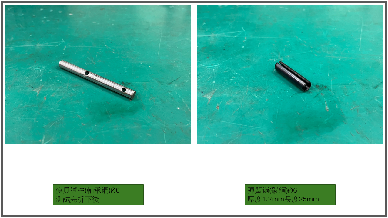 - 彈簧銷(碳鋼)3000次斷裂、插銷(不鏽鋼)3525次斷裂,導柱(軸承鋼)30000次還未斷裂