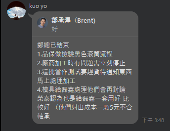 - 射出500pcs 29號下午2點取回後拿去加工。