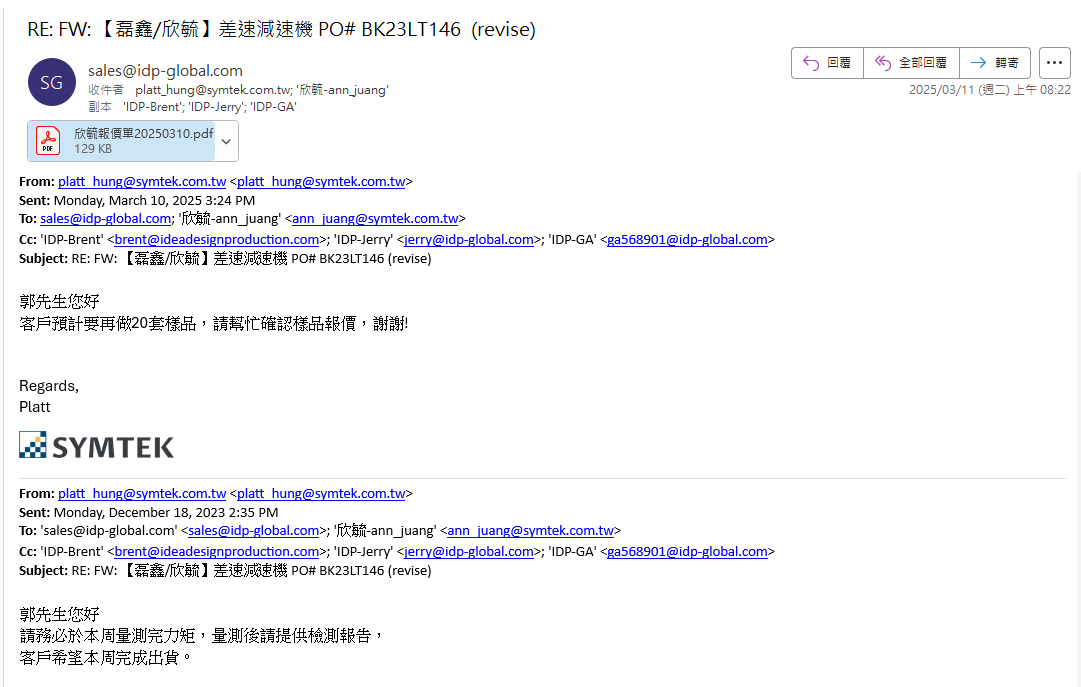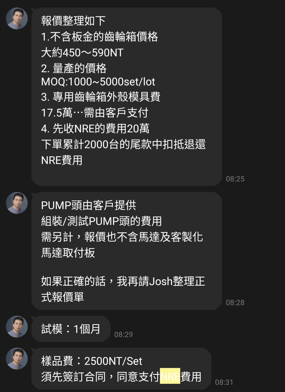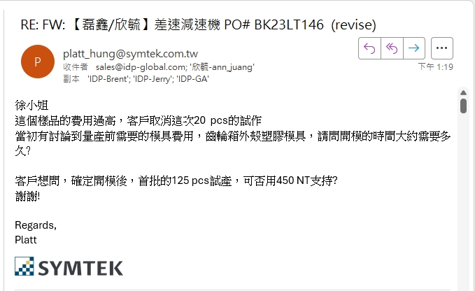 20250408:客戶取消20Pcs的試作,並詢問開模費及開模後試作費用