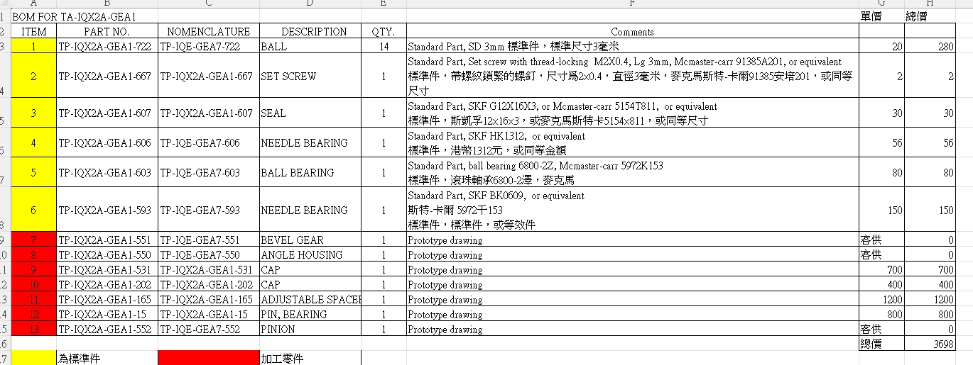 樣品零件預估價,不包含外殼與傘齒輪組,初步口頭報價樣品一組單價7~8000