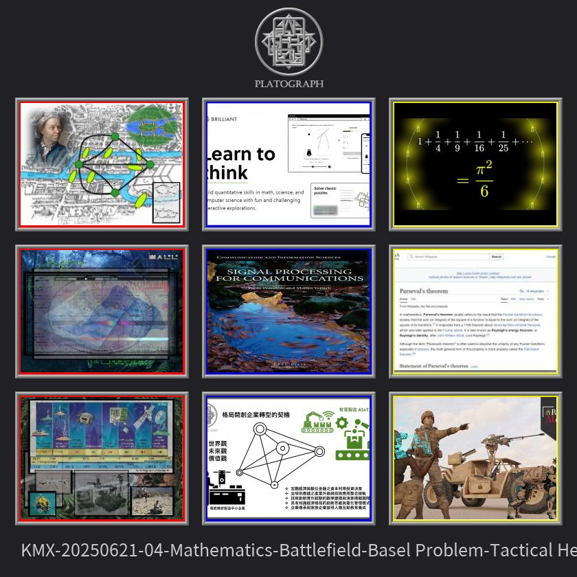 這些文件涵蓋了跨學科的廣泛主題,從數學與電腦科學到訊號處理與人工智慧。重點內容包括:由歐拉提出的七橋問題解法,介紹圖論與組合拓撲的基本概念;透過小波多尺度分析與碎形幾何,探索自然界的自相似現象與虛擬環境的建模;以及經由射頻(RF)頻段、發射與接收機制,以及干擾管理加密技術所構成的無線遙控系統。此外,文件也著重於互動式學習環境(特別是在通訊訊號處理方面)與人工智慧在武器系統中的應用整合。其中一項重要的數學主題是巴賽爾問題,特別是透過帕斯伐恒等式與傅立葉級數求得 的解法。這些主題也體現在如台北科技大學的 TuringEuler 計畫等專案中,整體展現了現代科學與技術中理論與應用的深度融合。