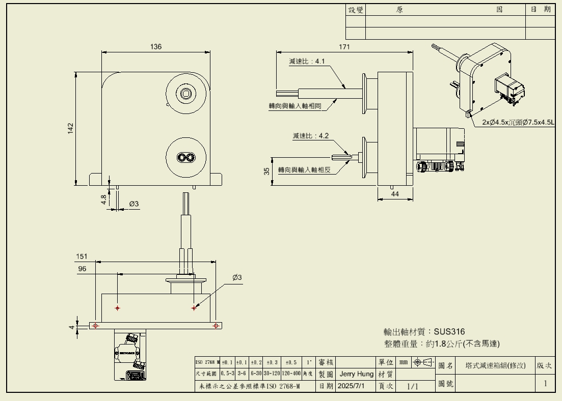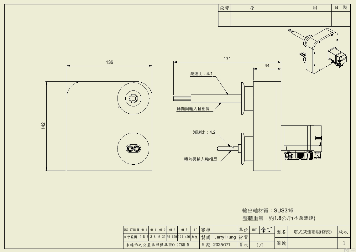 1.以目前軟體計算殼體與輸出軸重量已超過1.5公斤,加上齒輪與相關零組件總重會約在2.5公斤左右