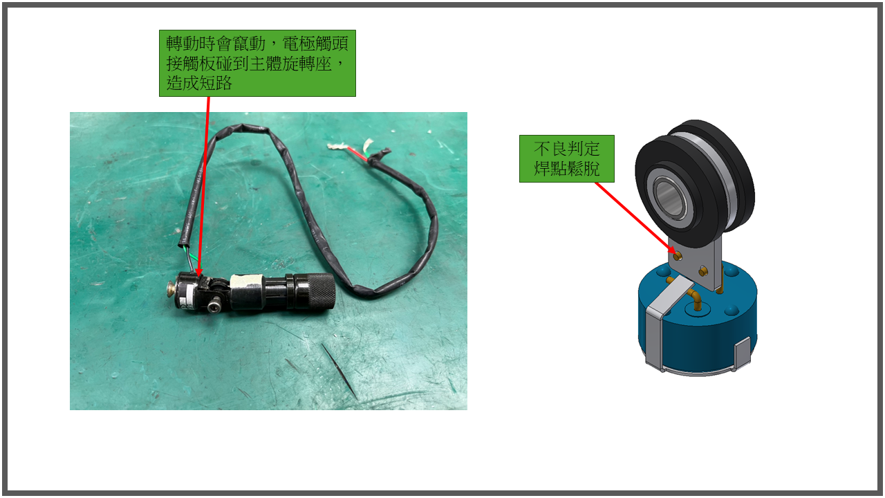 問題判定:A300電極組轉動時電極觸頭接觸板會竄動,接觸板碰到主體旋轉座,造成短路。
