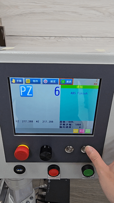 4. 執行程式>光柵感應=>重進程式(顯示異常)>需重開機才可執行程式;光柵感應後,按緊急停止開關,復歸後重進就可以了